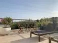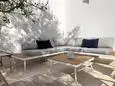 Terrace with garden furniture, gas barbecue, 6 sun loungers and 2 parasols. Living room with sitting area, air conditioning, TV and DVD. Fitted kitchen with single sink, American fridge with freezer compartment, gas stove, oven, extractor hood, microwave, dishwasher, Nespresso and mixer. Separate storage room with washing machine, vacuum cleaner, ironing board and iron.