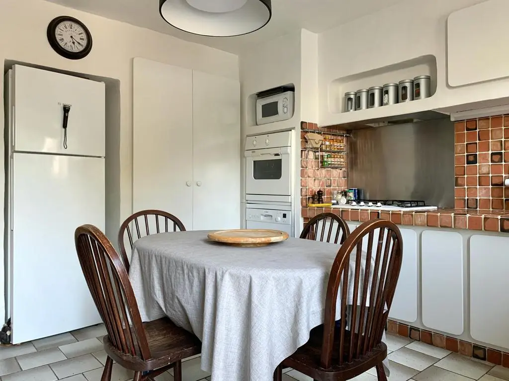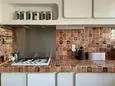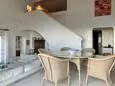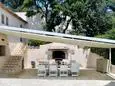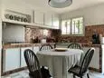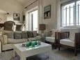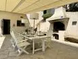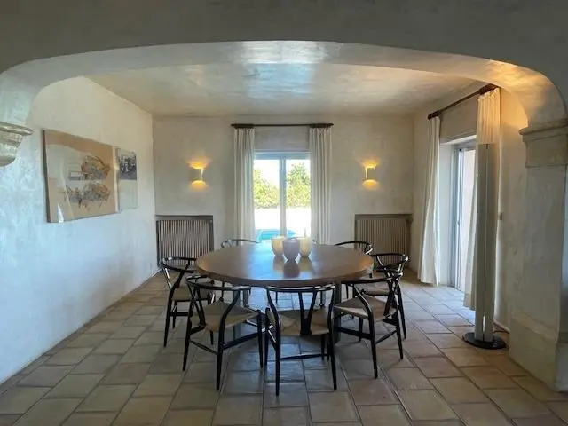 Terrace and covered terrace with garden furniture, charcoal barbecue, 8 sun loungers and parasols. Living room with sitting area, TV, DVD and fireplace. Fitted kitchen with double sink, large fridge with freezer, electric stove and gas stove, oven, extractor hood, microwave, dishwasher, coffee maker and mixer. Separate storage room with American fridge, sink, vacuum cleaner, ironing board and iron. 2 washing machines and dryer in the garage.
