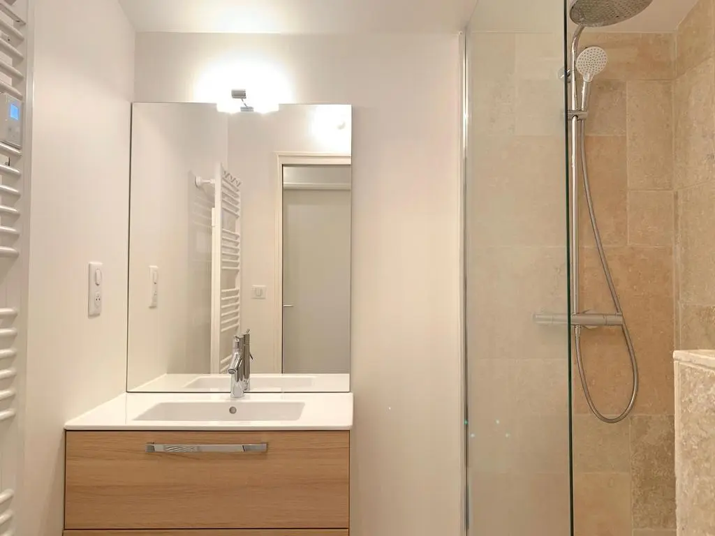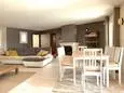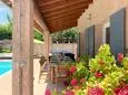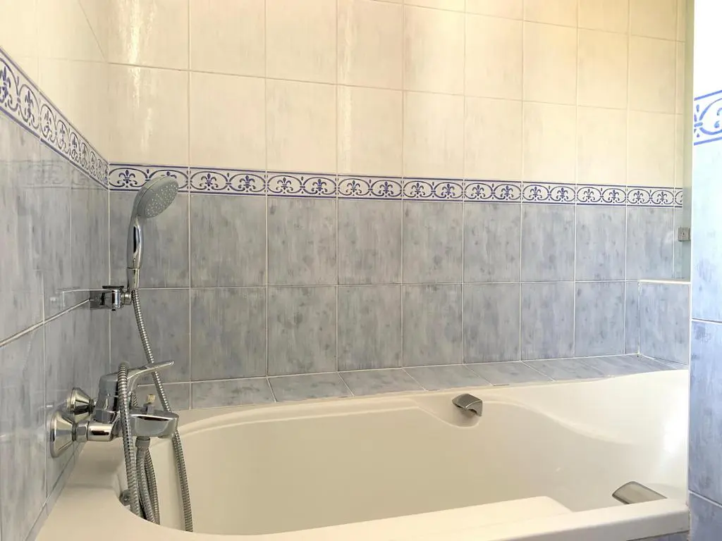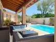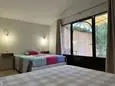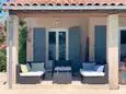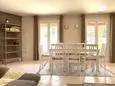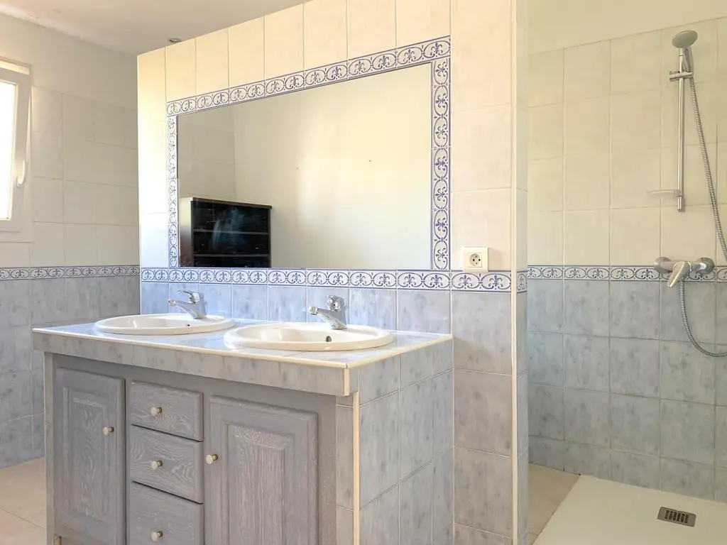 Terrace and covered terrace with garden furniture, barbecue, 8 sun loungers and 2 parasols. Living room with sitting area and TV. Fitted kitchen with American fridge, wine fridge, induction hobs, extractor hood, oven, microwave, dishwasher, Senseo coffee maker and mixer. Separate storage room with washing machine, vacuum cleaner, ironing board and iron.