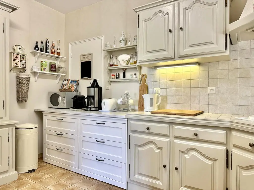 Terrasse et terrasse couverte avec mobilier de jardin, barbecue à charbon, 8 transats et 2 parasols. Séjour avec coin salon, clim, TV avec TV Vlaanderen, et feu ouvert. Cuisine équipée avec évier double, grand réfrigérateur avec compartiment congélateur, cuisinière électrique, hotte, four, four à micro-ondes, lave-vaisselle, Nespresso, Senseo, cafetière électrique et mixer. Buanderie avec lave-linge, sèche-linge, aspirateur, planche et fer à repasser.