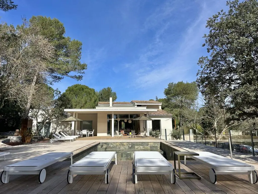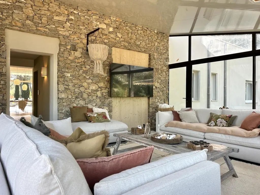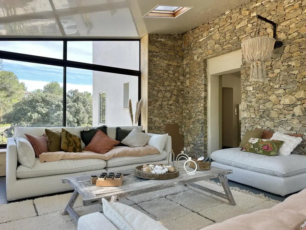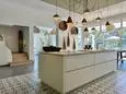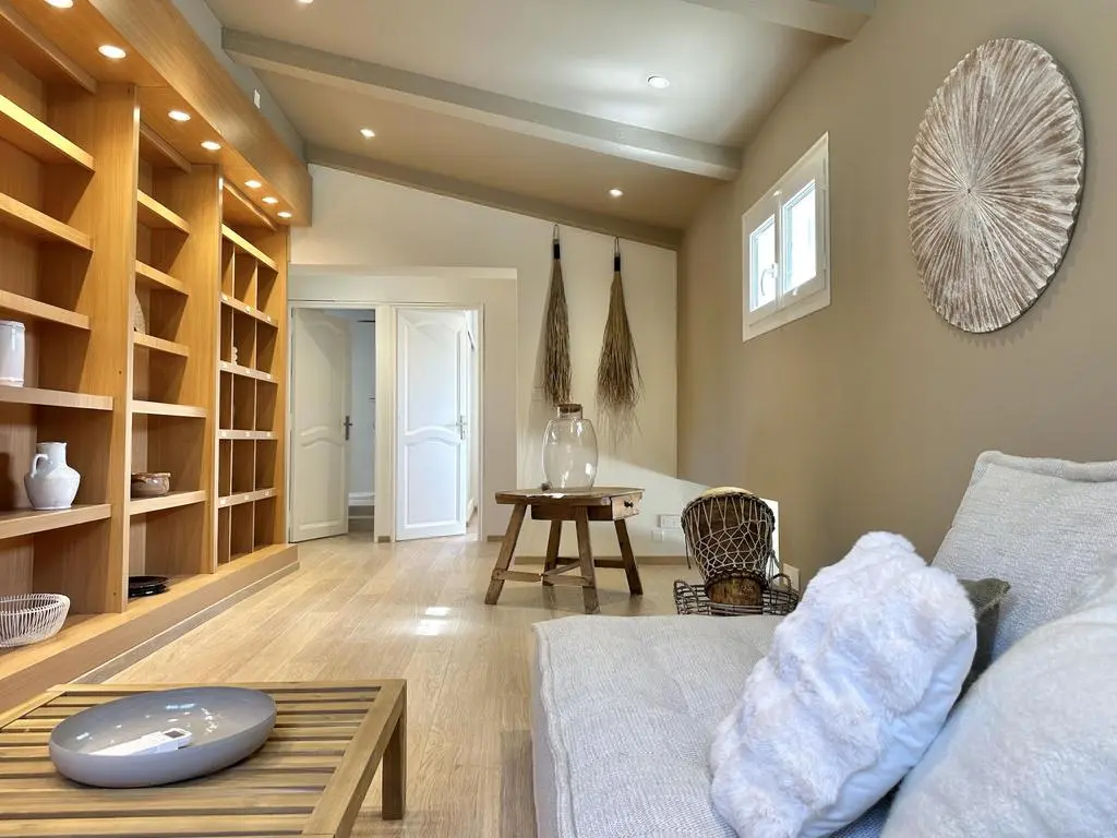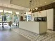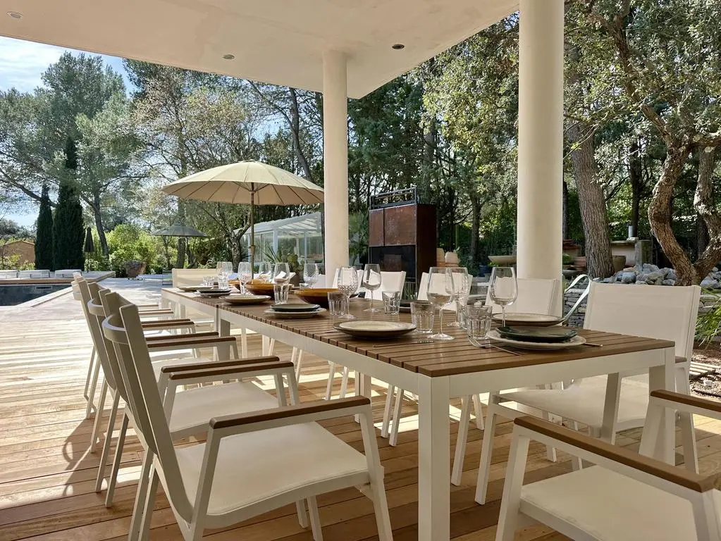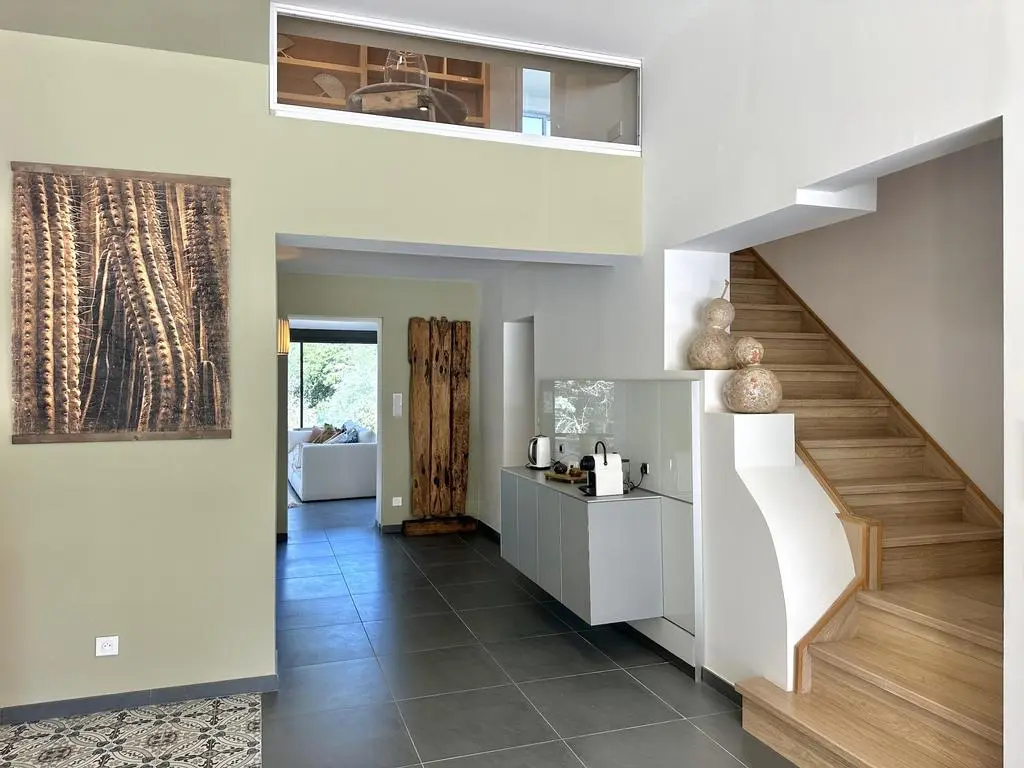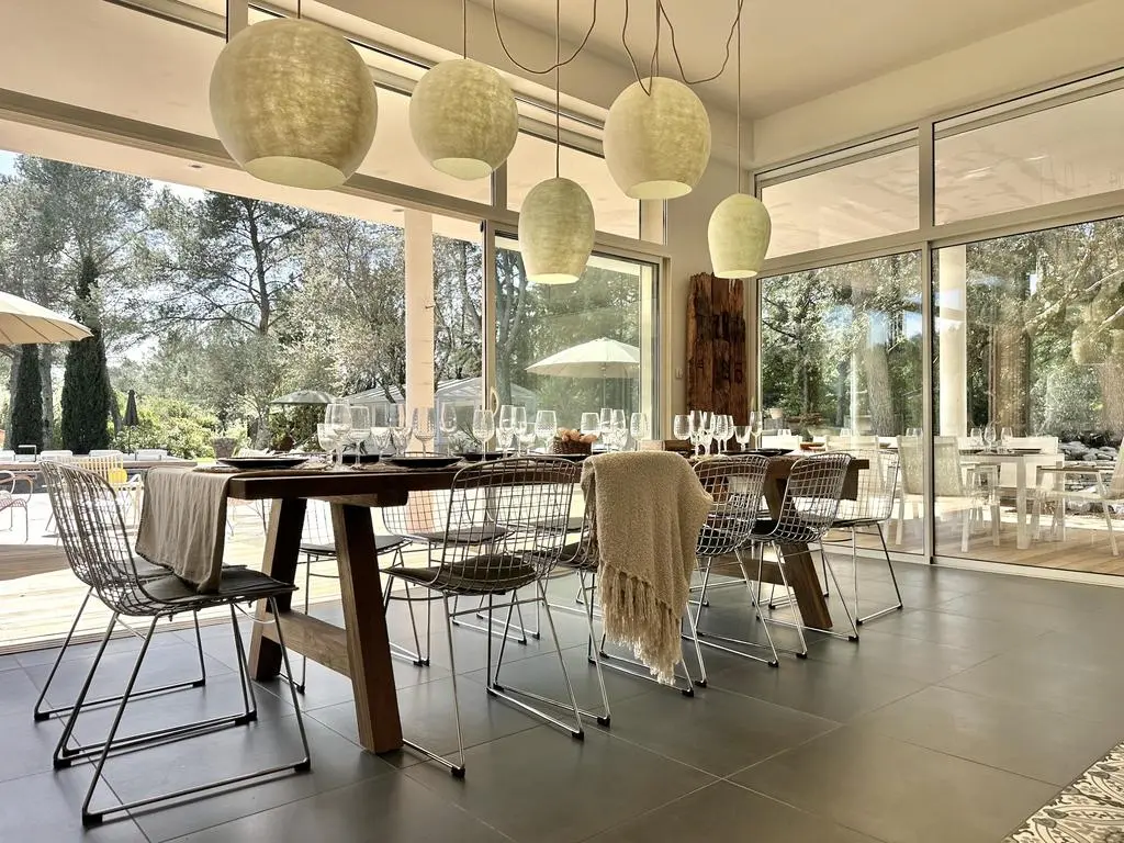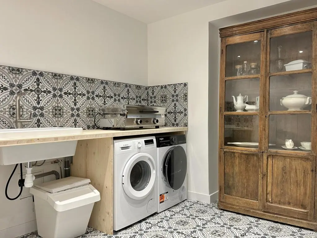 Terrasse et terrasse couverte avec mobilier de jardin, plancha électrique, 10 transats et 5 parasols. Séjour avec coin salon, clim, TV flatscreen et poêle à bois. Mezzanine avec coin salon. Cuisine équipée avec évier simple, réfrigérateur américain avec congélateur, grand réfrigérateur supplémentaire, plaques à induction, hotte, four, four à micro-ondes, lave-vaisselle, Nespresso et mixer. Buanderie avec lave-linge, sèche-linge, étendoir, aspirateur, planche et fer à repasser.
