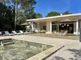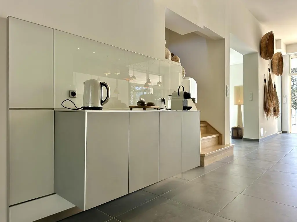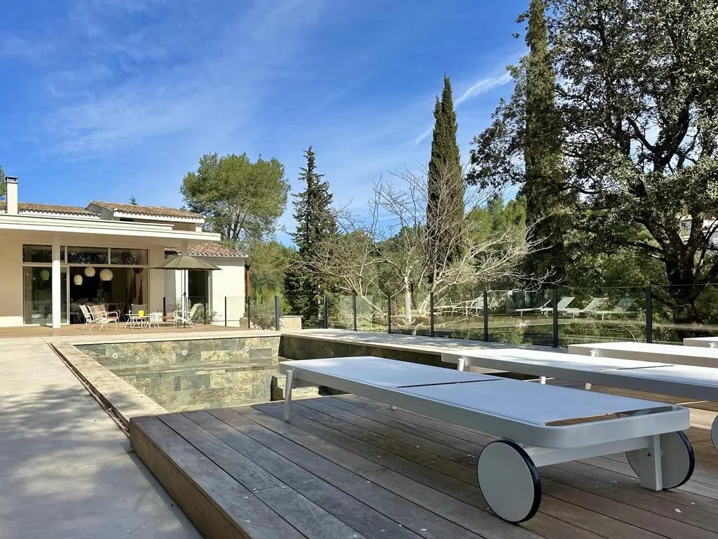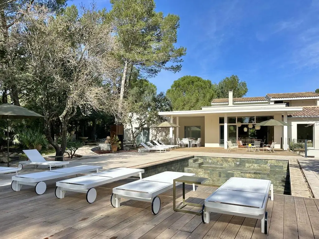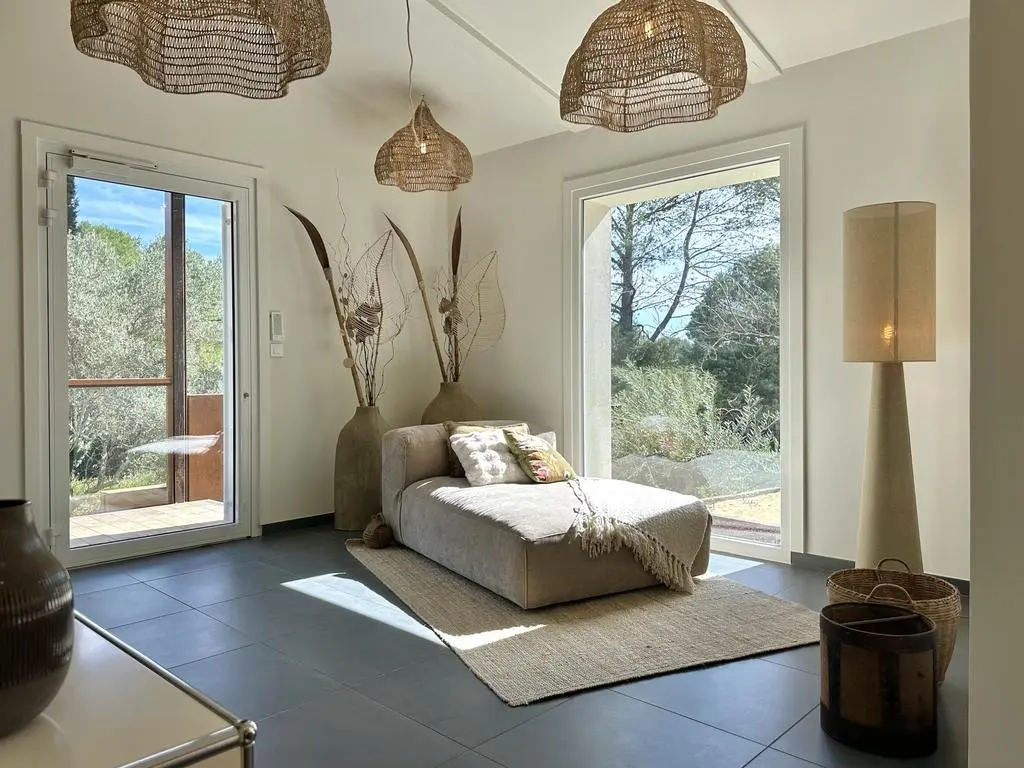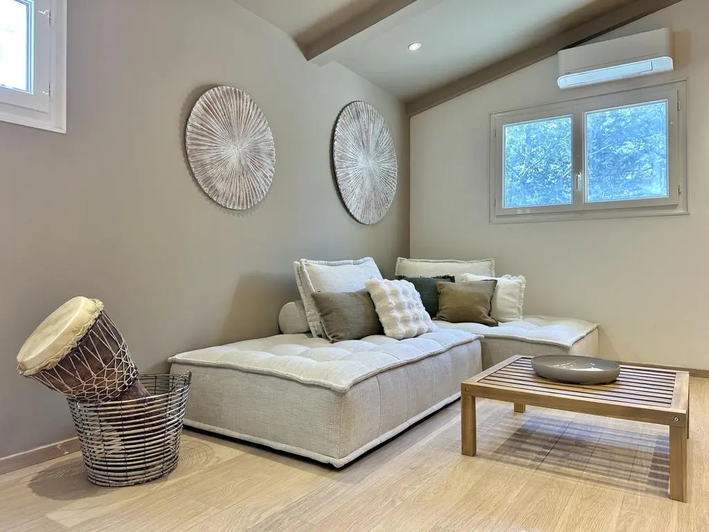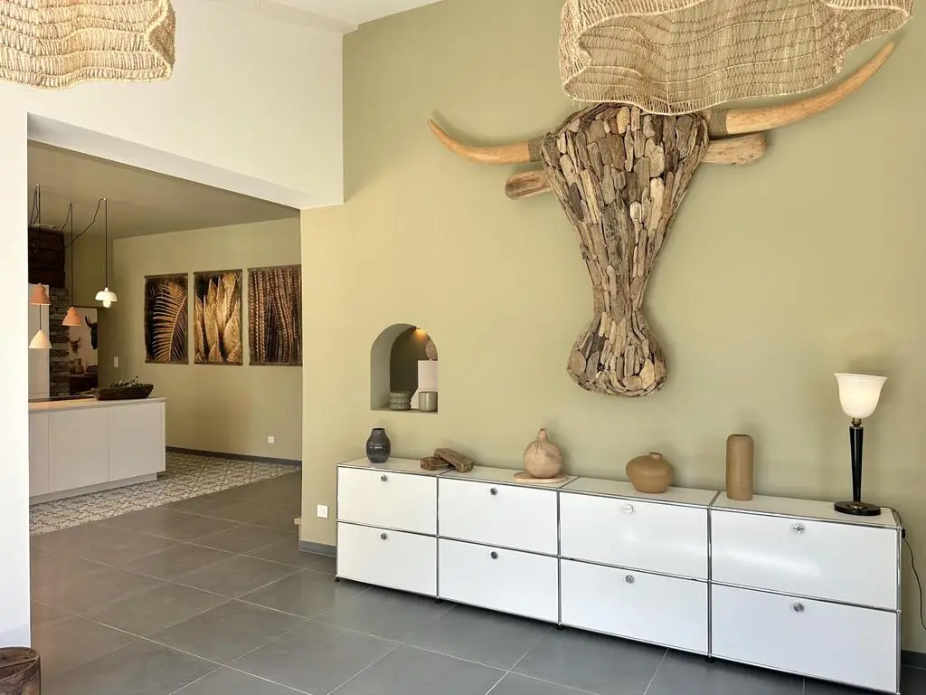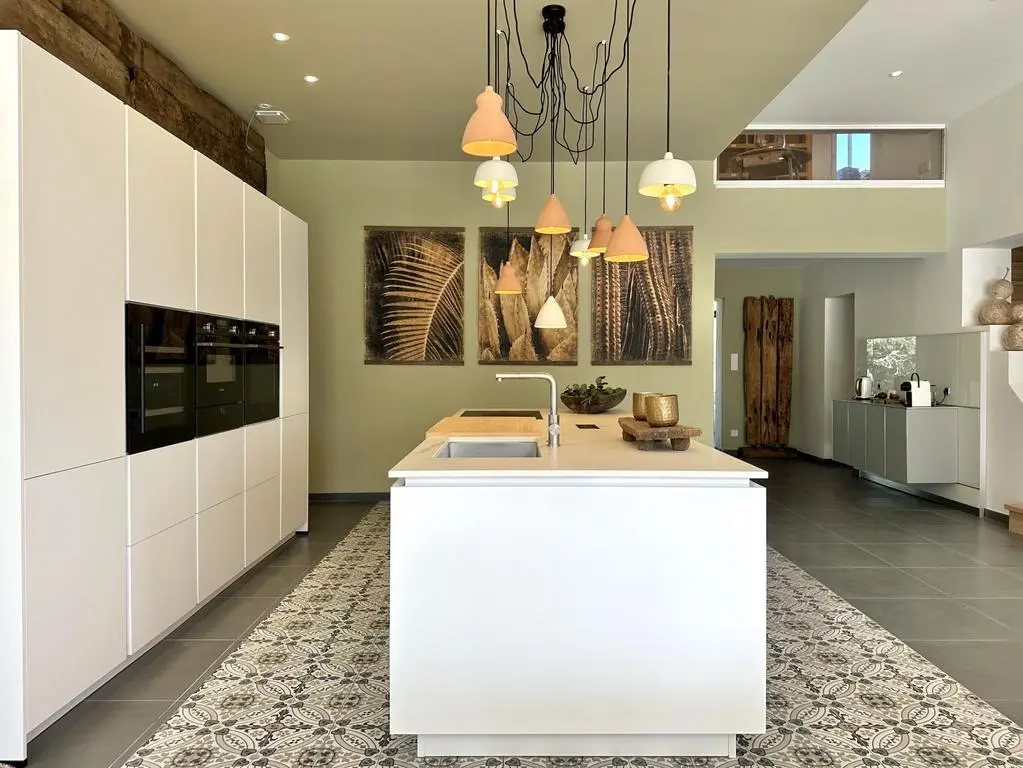 Terrasse et terrasse couverte avec mobilier de jardin, plancha électrique, 10 transats et 5 parasols. Séjour avec coin salon, clim, TV flatscreen et poêle à bois. Mezzanine avec coin salon. Cuisine équipée avec évier simple, réfrigérateur américain avec congélateur, grand réfrigérateur supplémentaire, plaques à induction, hotte, four, four à micro-ondes, lave-vaisselle, Nespresso et mixer. Buanderie avec lave-linge, sèche-linge, étendoir, aspirateur, planche et fer à repasser.