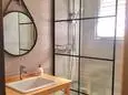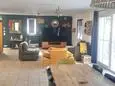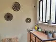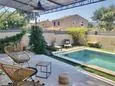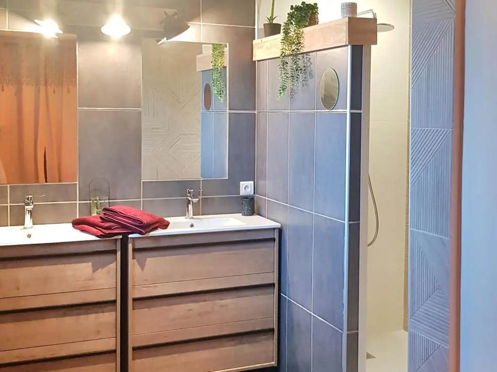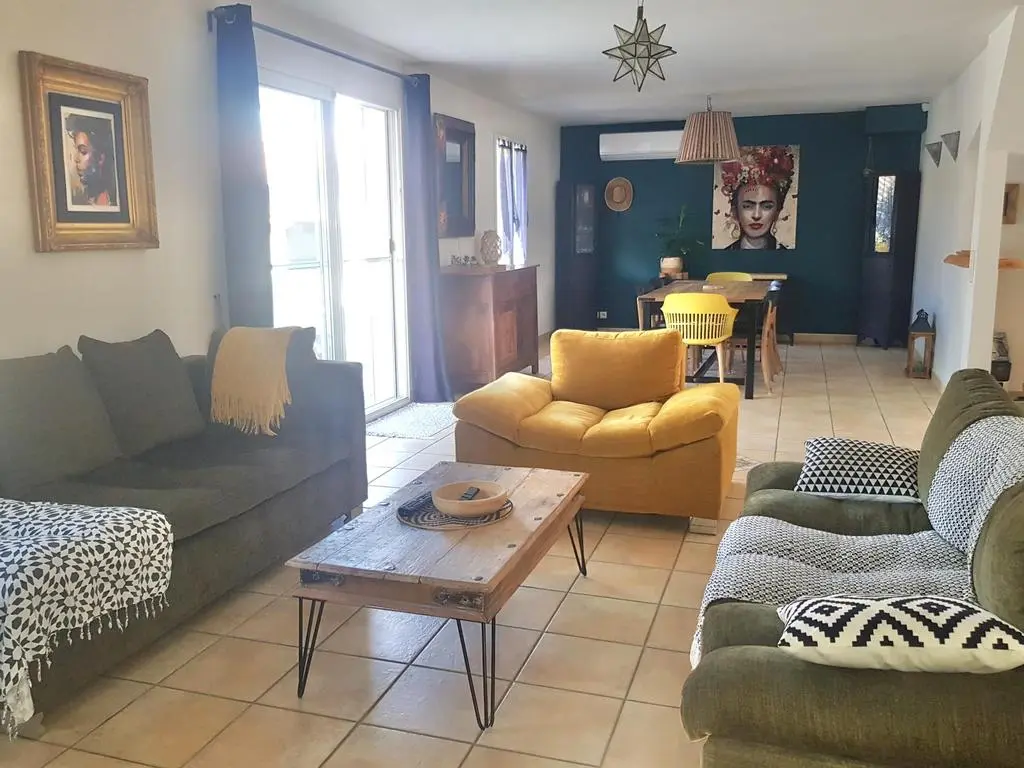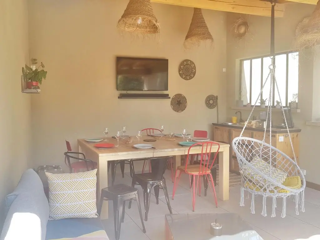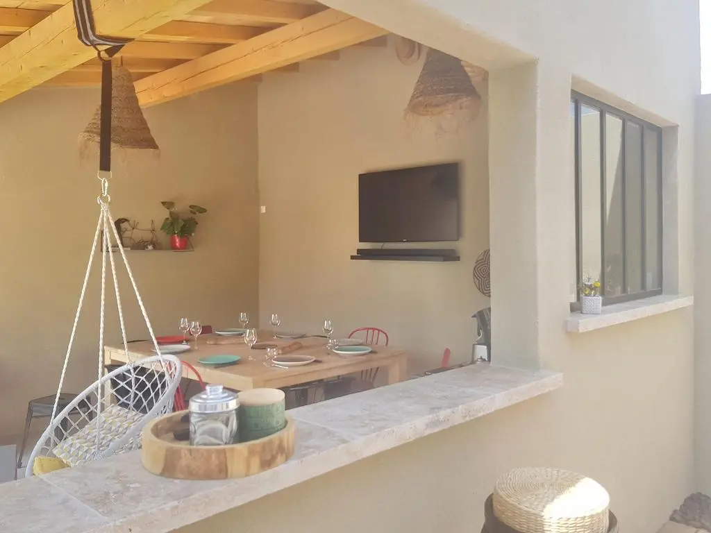 Terrasse et terrasse couverte avec mobilier de jardin, pergola, barbecue à charbon, plancha à gaz et 2 transats. Séjour avec coin salon, clim, smart TV, moustiquaire et poêle à pellets. Cuisine équipée avec évier simple, réfrigérateur américain avec congélateur, plaques à induction, hotte, four, four à micro-ondes, lave-vaisselle, machine espresso à café moulu et mixer. Buanderie avec lave-linge, étendoir, aspirateur, planche et fer à repasser.