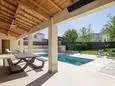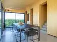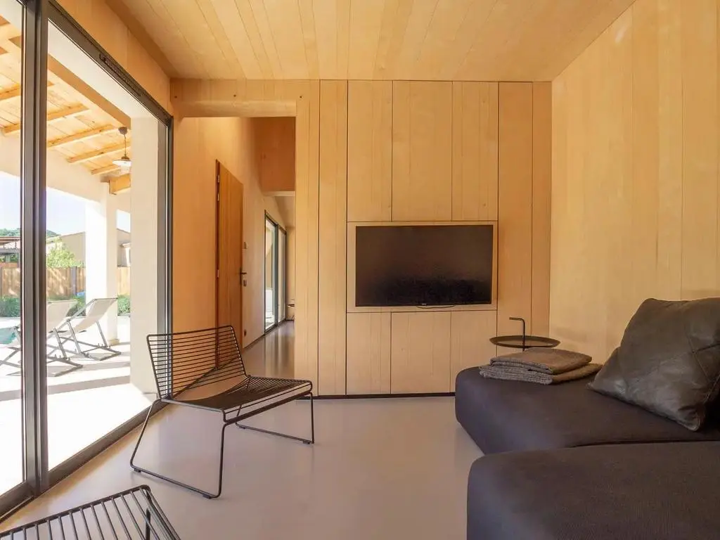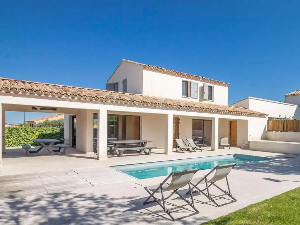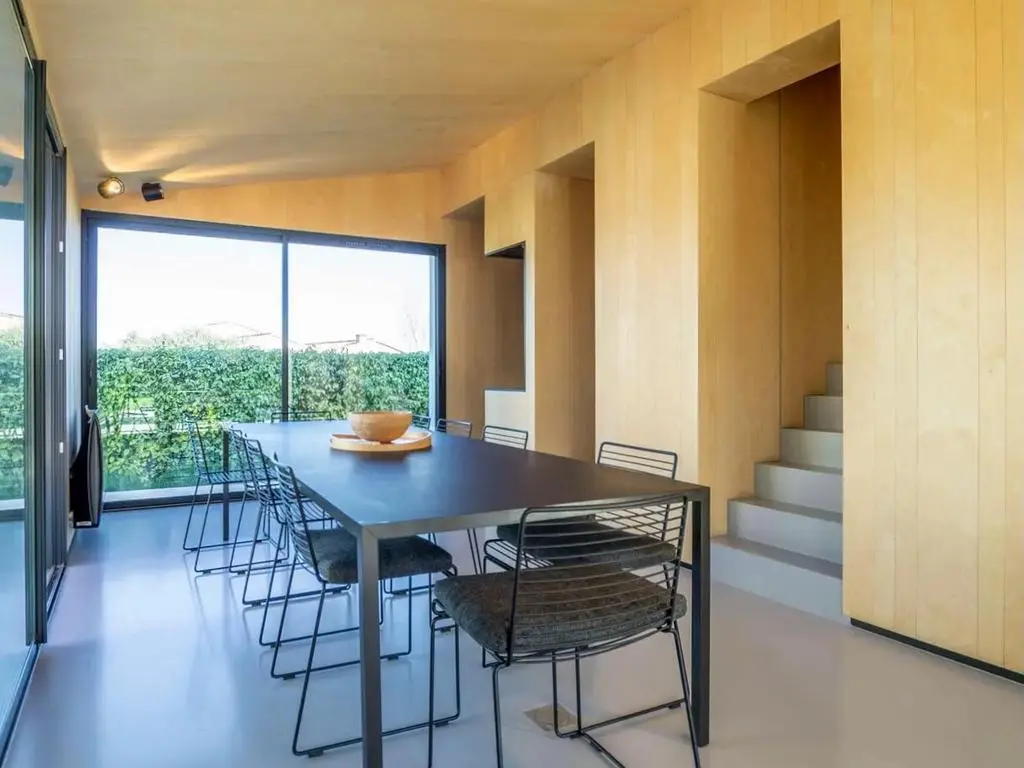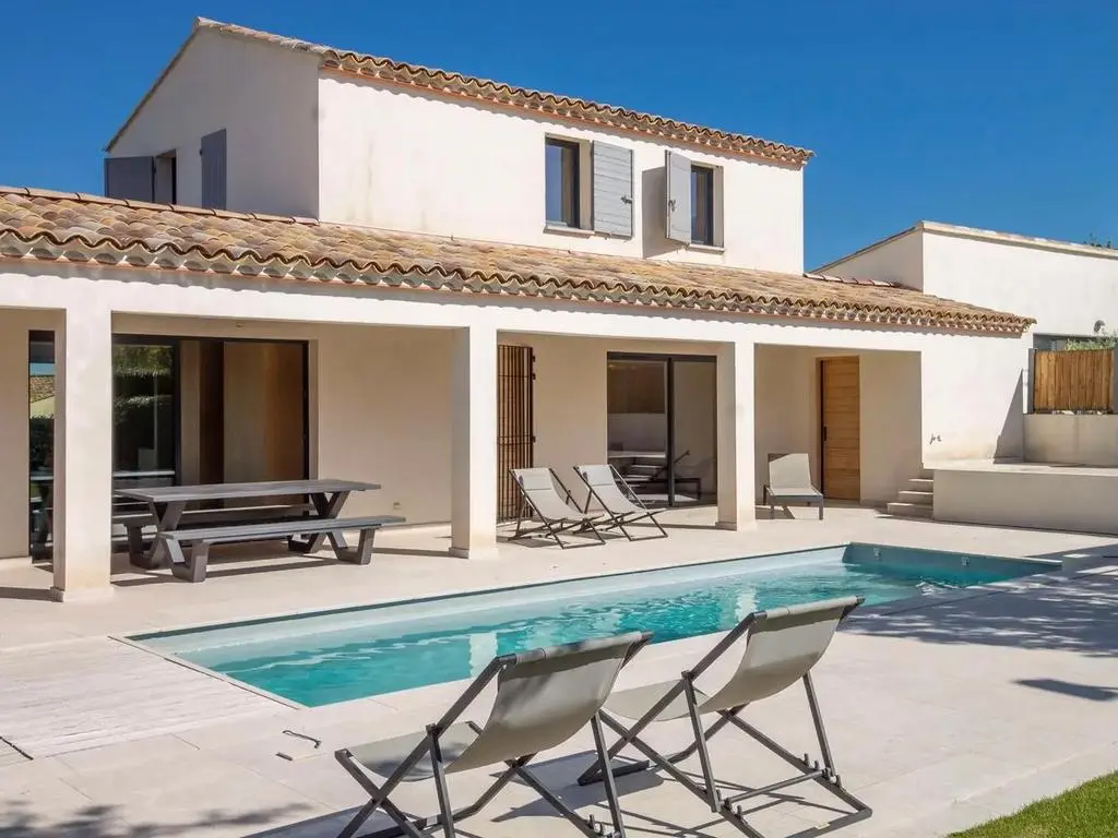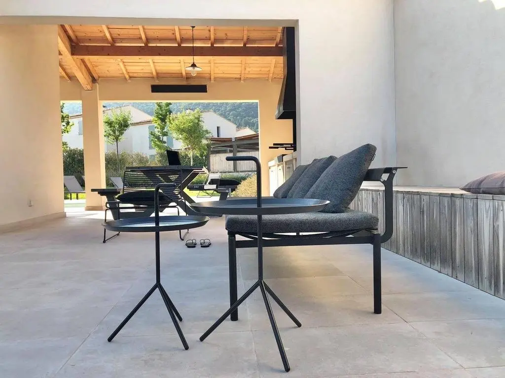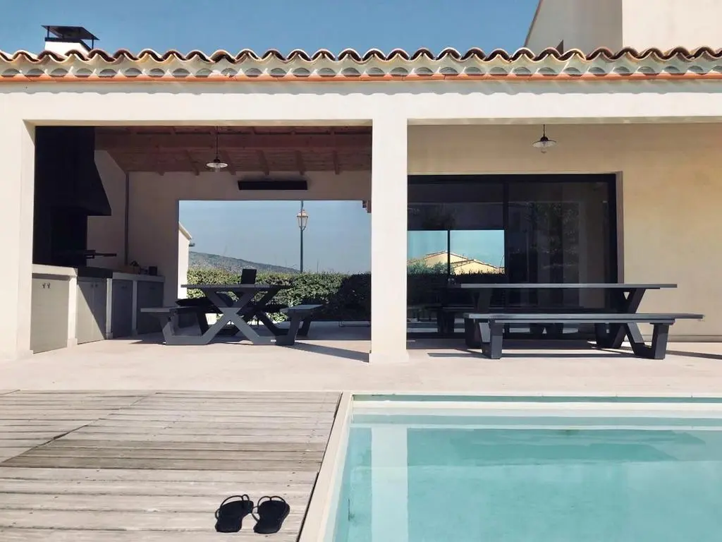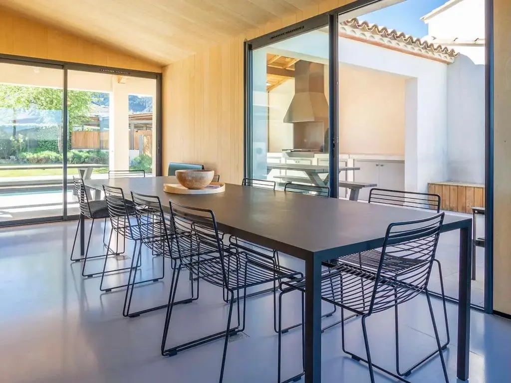 Terrasse et terrasse couverte avec mobilier de jardin, barbecue à charbon et 8 transats. Séjour avec coin salon, smart TV, Apple TV et DVD. Cuisine équipée avec évier simple, grand réfrigérateur avec compartiment congélateur, plaques à induction, hotte, four à micro-ondes, lave-vaisselle et Nespresso. Buanderie avec lave-linge, sèche-linge, étendoir, aspirateur, planche et fer à repasser.