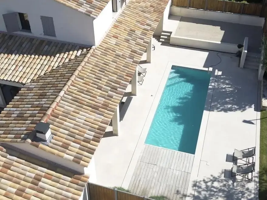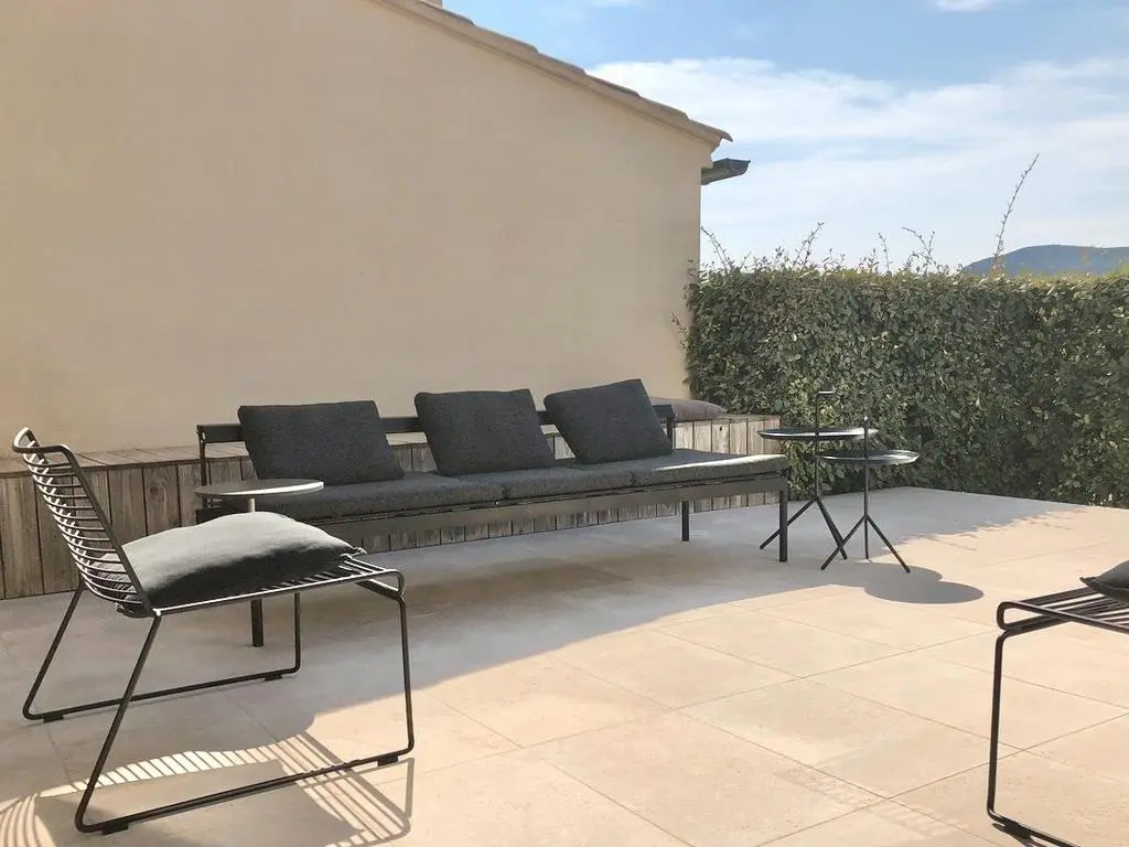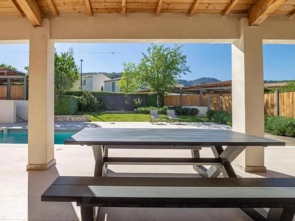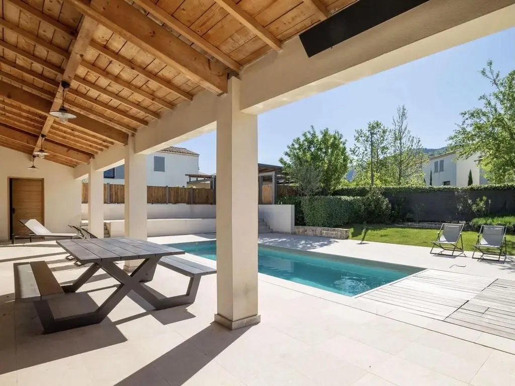 Cette élégante maison d'architecte est mitoyenne et située dans un domaine calme et clos, à quelques pas du village de Malaucène et à 20 km du Géant de Provence, le Mont Ventoux.