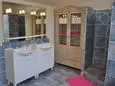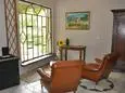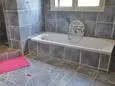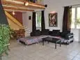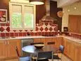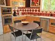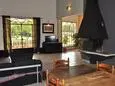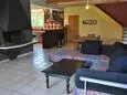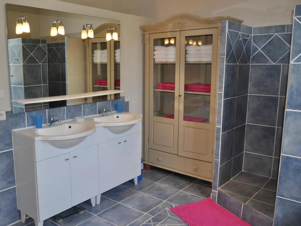 Terrasse et terrasse couverte avec mobilier de jardin, barbecue à gaz, 6 transats et un parasol. Séjour avec coin salon et TV flatscreen. Cuisine équipée avec évier simple, grand réfrigérateur avec compartiment congélateur, plaques à gaz, hotte, four, four à micro-ondes, lave-vaisselle, Senseo, cafetière italienne et mixer. Buanderie avec lave-linge, étendoir, aspirateur, planche et fer à repasser.