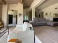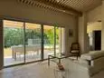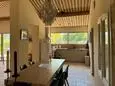 Terrasse et terrasse couverte avec mobilier de jardin, barbecue électrique, 8 transats et un parasol. Séjour avec coin salon, clim et smart TV. Cuisine équipée avec évier double, grand réfrigérateur avec congélateur séparé, plaques électriques, hotte, four, four à micro-ondes, lave-vaisselle et Senseo. Buanderie avec lave-linge, aspirateur, planche et fer à repasser.