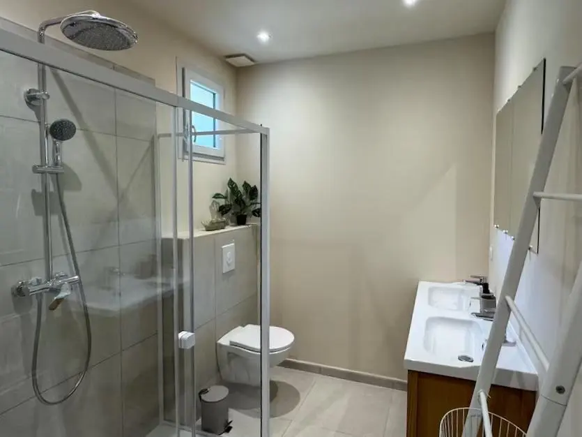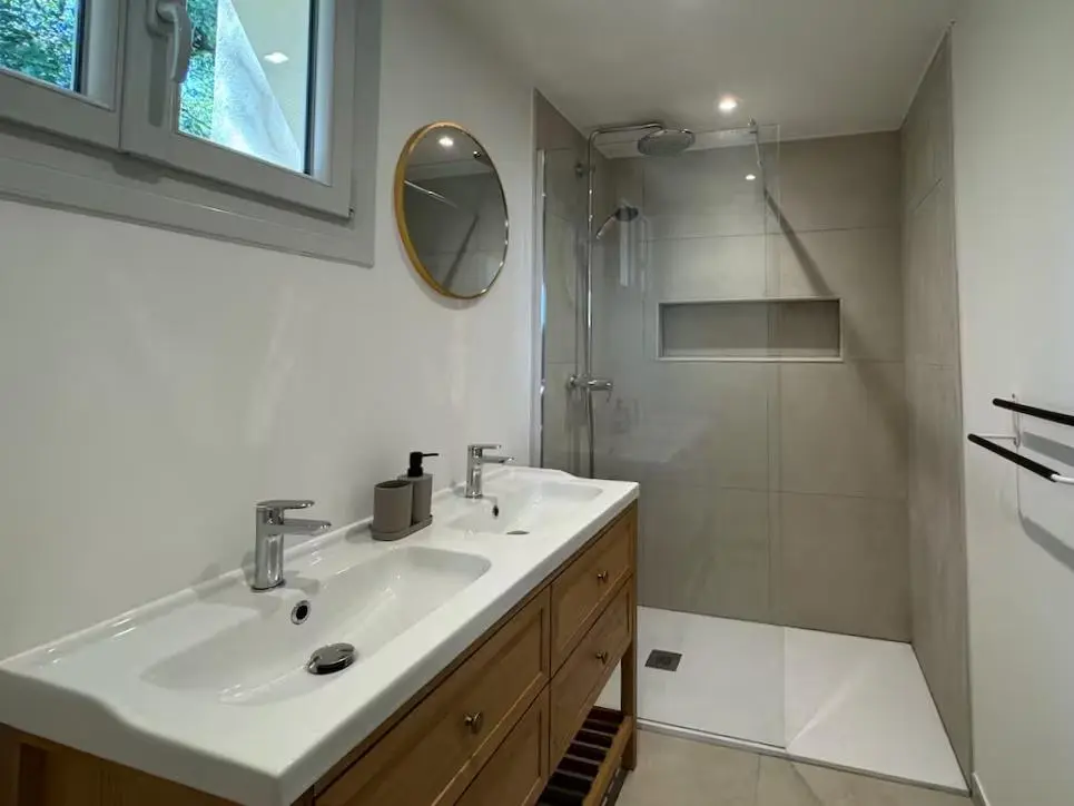 • ch 1 avec lit 180 cm, clim, ensuite salle de bain avec douche, 2 lavabos et WC (RDC)