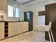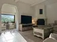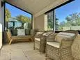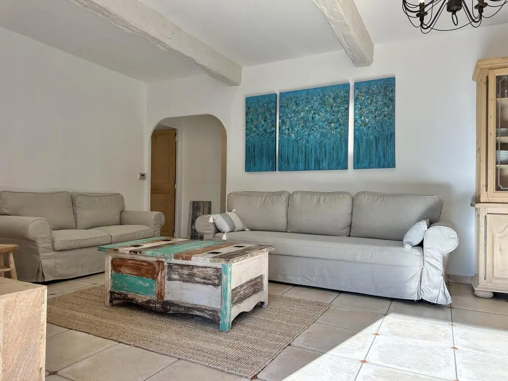 Terras en overdekt terras met tuinmeubels, barbecue op houtskool en 8 ligzetels. Living met zithoek, airco, smart TV en muggenraam. Ingerichte keuken met enkele spoelbak, grote koelkast, bijkomende grote koelkast met vriesvak, inductie kookplaten, dampkap, oven, microgolfoven, vaatwasmachine en koffiezet. Aparte berging met wasmachine, droogrek, stofzuiger, strijkplank en strijkijzer.