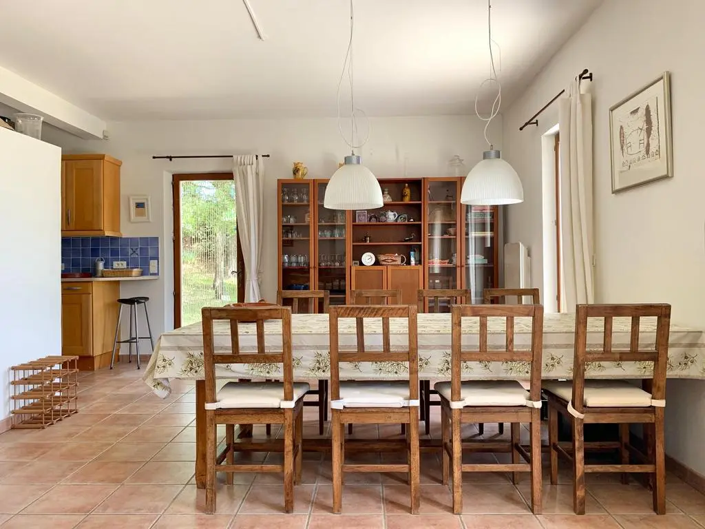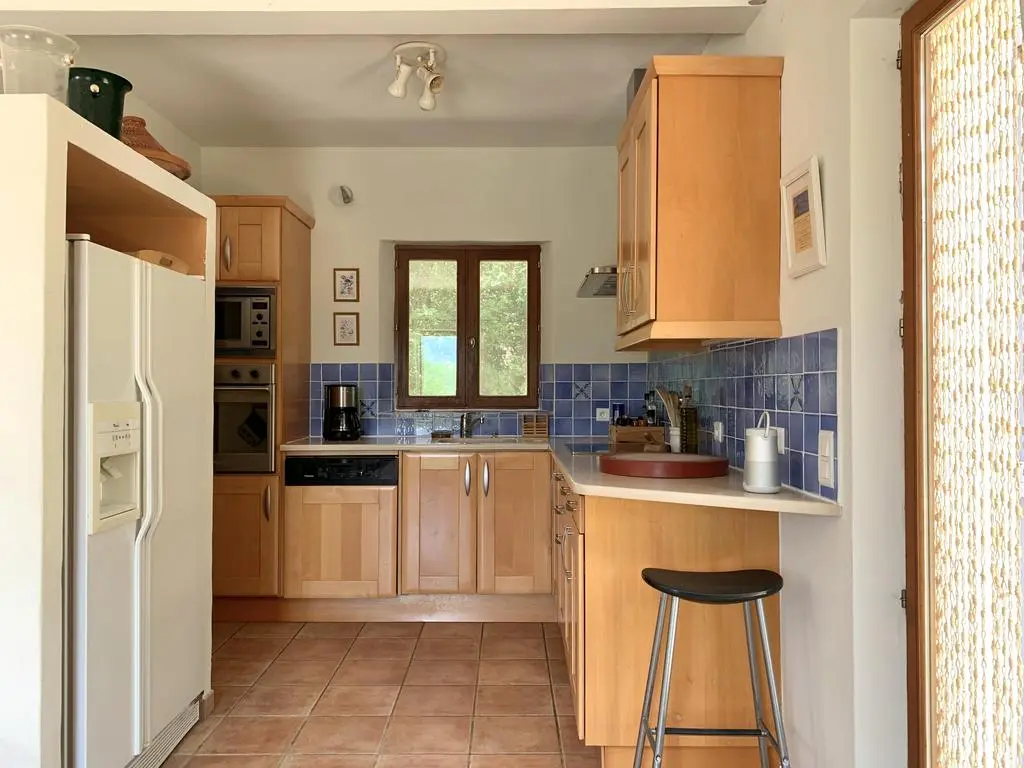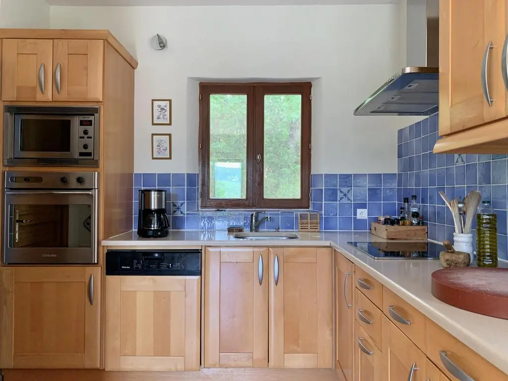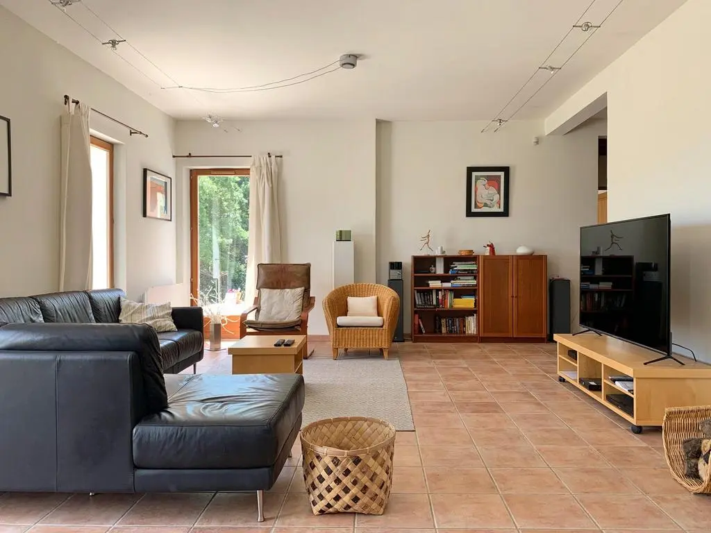 Grote (25 are), deels beboste, zonnige tuin met groot terras (160 m²) met, gespreid over het domein, verschillende zowel lommerrijke als zonnige settings met ligzetels (8), tuintafels (4), -stoelen (20), barbecue en buitenverlichting. Ruime living met zithoek, grote Ultra HD Smart-TV flat screen (163 cm) met google TV streamer. Ingerichte keuken met Amerikaanse frigo, inductiefornuis, oven, dampkap, microgolfoven, vaatwasmachine, koffiezet. Wasplaats met wasmachine, droogkast, lavabo, strijkijzer en strijkplank.