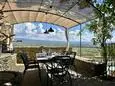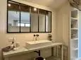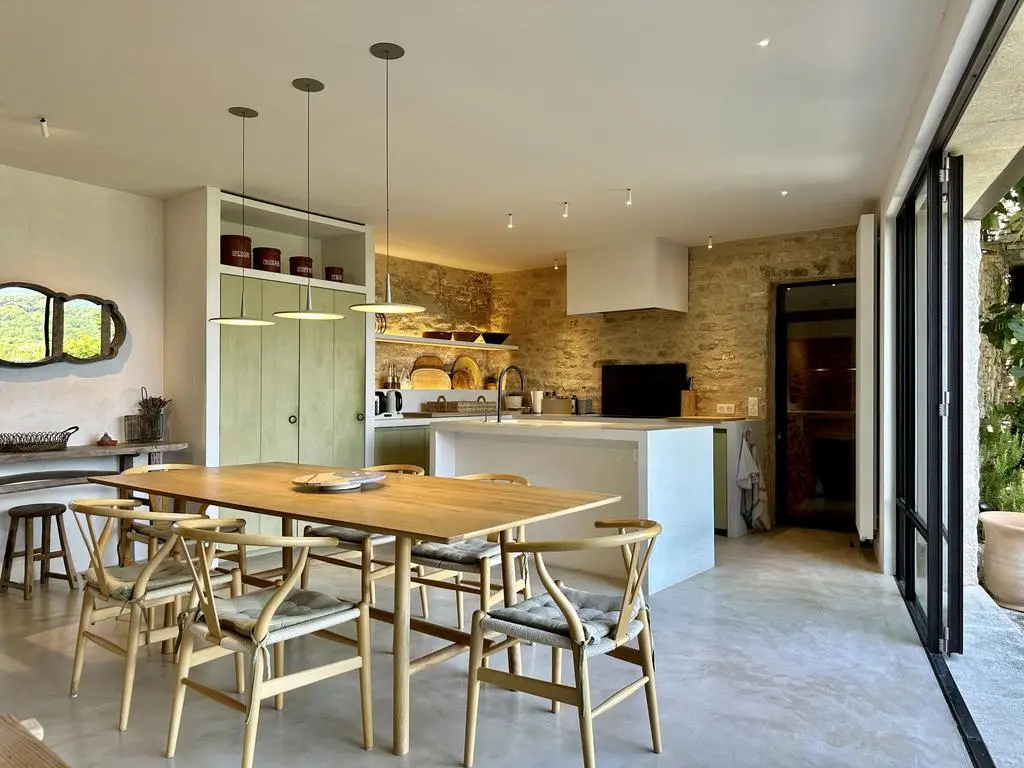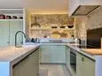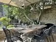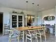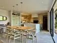 Zonneterras met 6 ligzetels en een parasol, schaduwrijk terras met lounge en overdekt terras met pergola, eettafel en barbecue op gas. Living met zithoek, TV, DVD en open haard. Modern ingerichte keuken met enkele spoelbak, grote koelkast met vriesvak, elektrische kookplaten, dampkap, oven, microgolfoven, vaatwasmachine, Nespresso en mixer. Aparte berging met wasmachine, droogkast, extra koelkast met aparte diepvries, stofzuiger, strijkijzer en strijkplank.