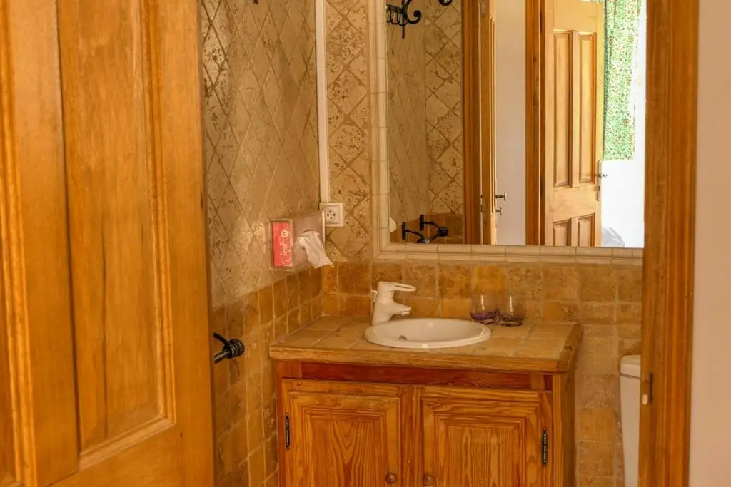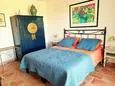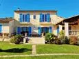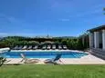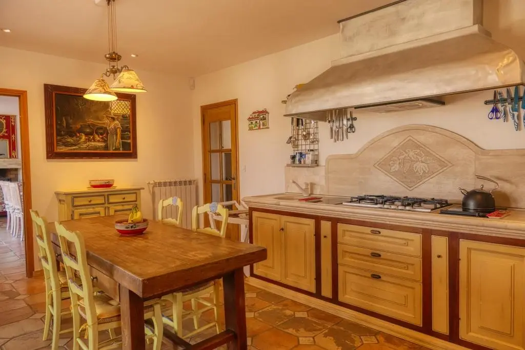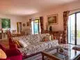 Terras en overdekt terras met tuinmeubels, plancha, 14 ligzetels en 4 parasols. Living met zithoek, airco en smart TV. Ingerichte keuken met enkele spoelbak en dubbele spoelbak, Amerikaanse koelkast met diepvries, grote koelkast, aparte diepvries, bijkomende kleine koelkast, gasfornuis en 2 elektrische kookplaten, dampkap, oven, microgolfoven, vaatwasmachine, Nespresso, koffiezet en mixer. Aparte berging met wasmachine, droogkast, stofzuiger, strijkplank en strijkijzer.