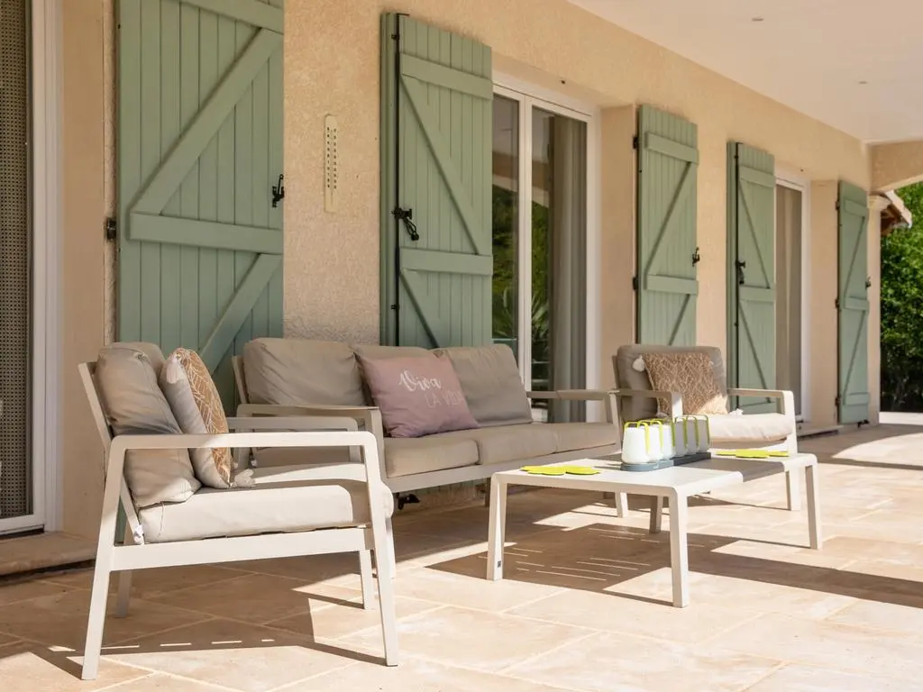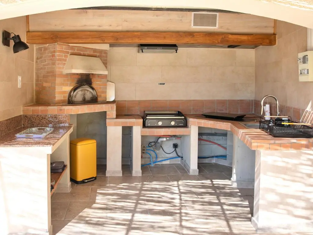 Terras en overdekt terras met tuinmeubels, barbecue op houtskool (Weber), plancha, pizza oven en 6 ligzetels. Living met zithoek, TV en houtkachel. Ingerichte keuken met enkele spoelbak, koelkast, inductiekookplaat, dampkap, oven, microgolfoven, vaatwasmachine, espressomachine met bonen (Delonghi) en mixer. Aparte berging met Amerikaanse koelkast met diepvries, wasmachine, stofzuiger, strijkplank en strijkijzer.