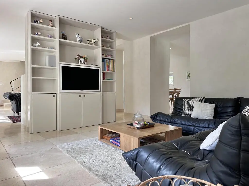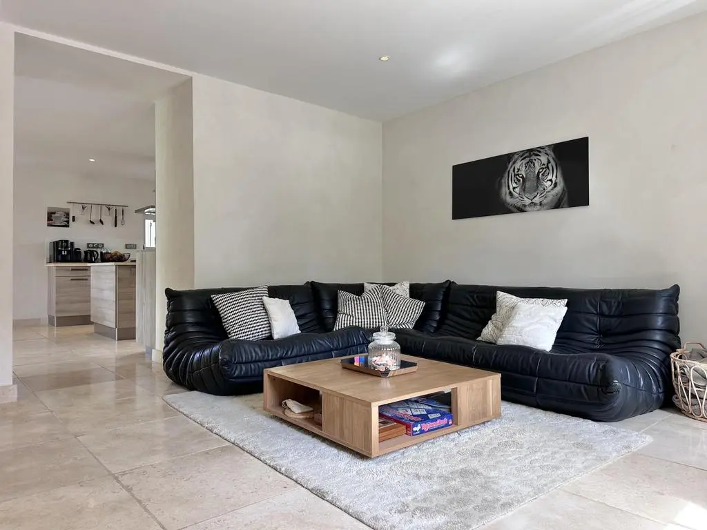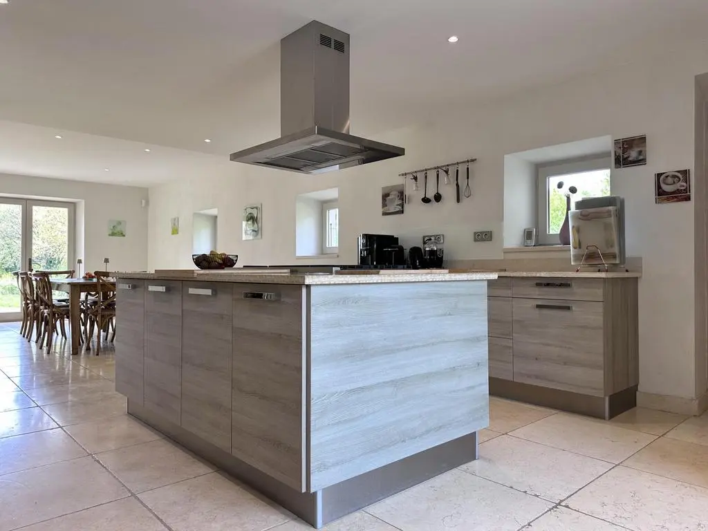 Terras met tuinmeubels en schaduwdoeken, barbecue op gas, 8 ligzetels en 2 parasols. Living met zithoek, flatscreen TV met DVD en open haard. Ingerichte open keuken met enkele spoelbak, Amerikaanse koelkast met diepvries, kookpitten op gas, dampkap, oven, microgolfoven, vaatwasmachine, Nespresso, Senseo en espressomachine met koffiebonen. Aparte berging met wasmachine, droogkast, droogrek, stofzuiger, strijkplank en strijkijzer.